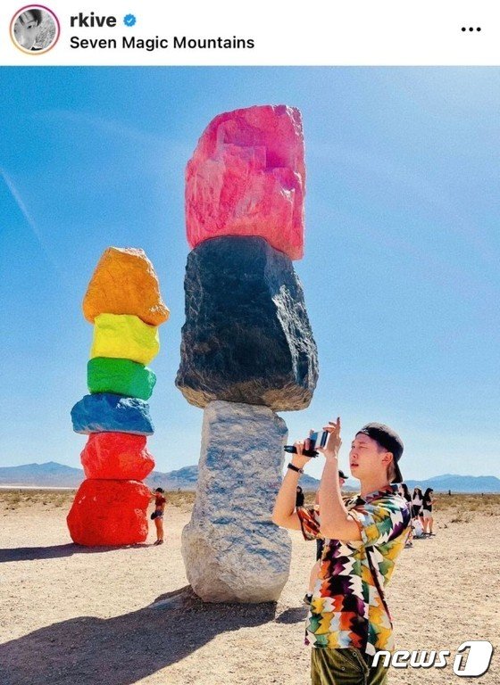 사진 속 RM은 형형색색의 거대한 돌 조각을 배경으로 자세를 취했다. 세계 현대미술을 주도하는 작가 중 한명인 우고 론디노네 작품이 설치된 미국 네바다 사막 ‘세븐 매직 마운틴’ 앞에서다.