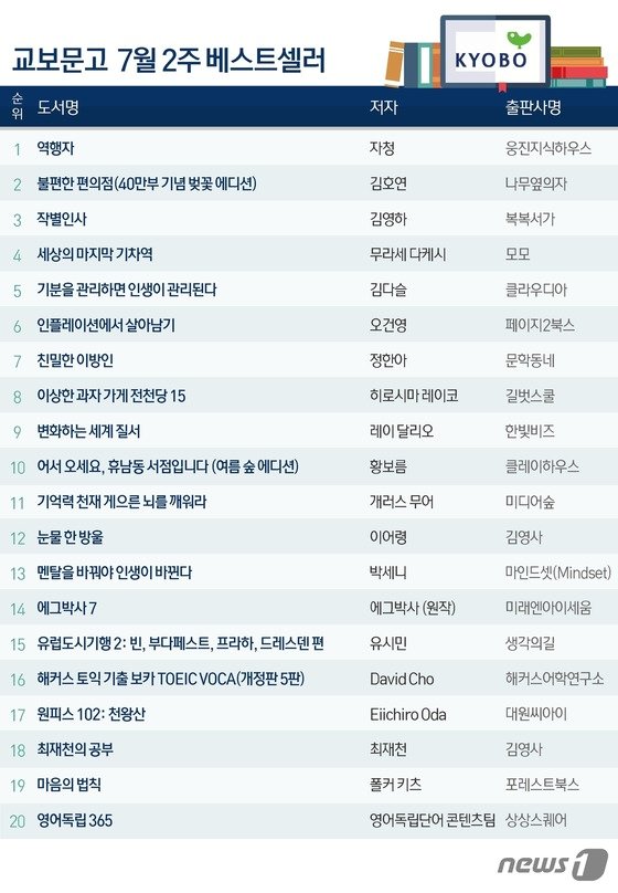 15일 교보문고가 집계한 7월 2주차 종합 베스트셀러 순위에 따르면 ‘불편한 편의점'(2위·김호연)과 ‘작별인사'(3위·김영하)에 이어 ‘세상의 마지막 기차역'(4위·무라세 다케시), ‘친밀한 이방인'(7위·정한아), ‘어서 오세요, 휴남동 서점입니다'(10위·황보름) 등 10위권에 5종의 소설이 포진했다.