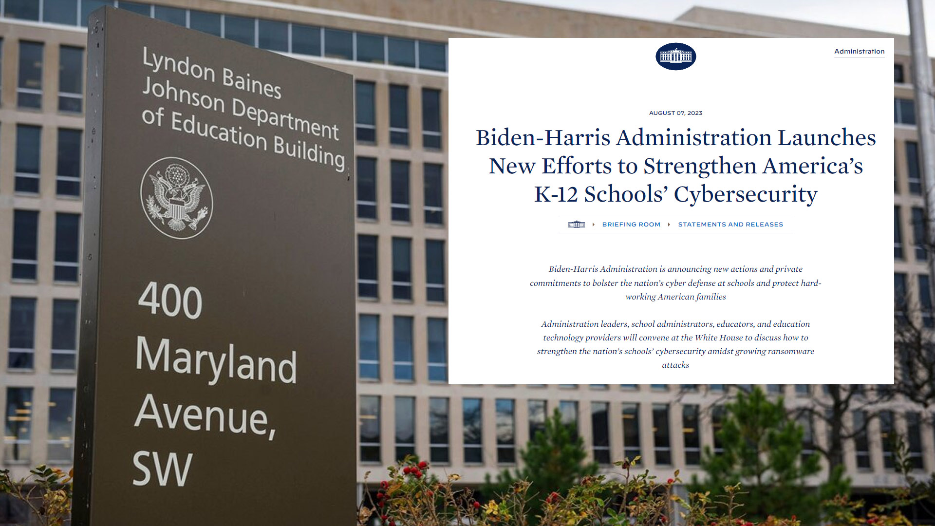 백악관은 보도자료에서 “최근 몇 년간 미국의 학교들을 대상으로 한 사이버 공격이 증가하고 있다”며 “2022~23학년도에만 전국 초중고 학군 중 최소 8곳이 심각한 사이버 공격으로 영향을 받았으며, 이 중 4곳은 수업을 취소하거나 완전히 문을 받아야 했다”고 밝혔다.
