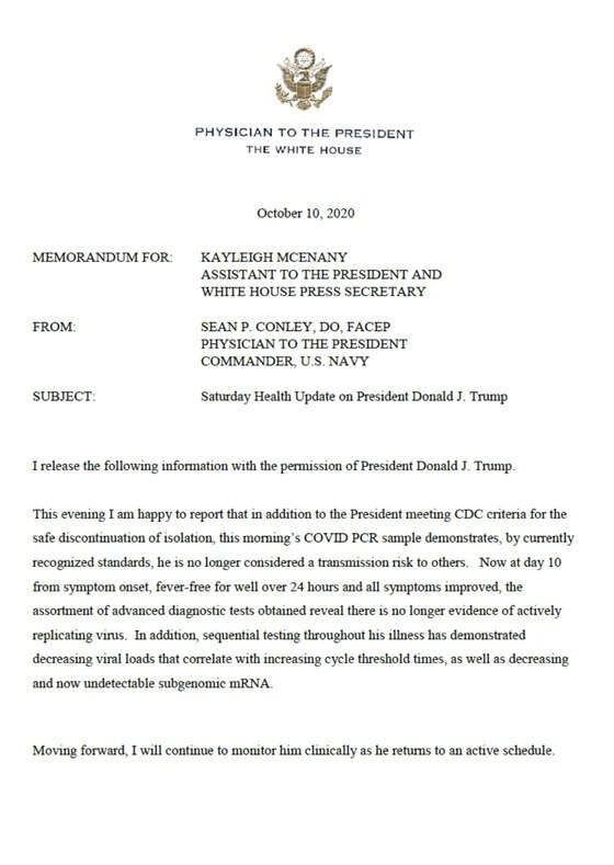 다만 그는 트럼프 대통령에게 “(코로나19) 증상이 나타난 지 10일째 된 날, 24시간이 지나도록 열이 없었고 모든 증상이 개선됐다”며 “상세 진단검사 평가에서도 더 이상 활성화된 바이러스가 증식됐다는 증거가 나오지 않았다”고 설명했다.