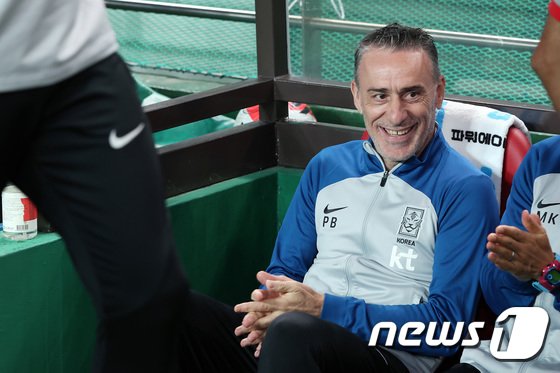 파울루 벤투 감독이 27일 오후 서울 마포구 상암동 서울월드컵경기장에서 열린 대한민국과 카메룬의 친선경기 전반전에 앞서 미소 짓고 있다. 2022.9.27/뉴스1 © News1 이동해 기자