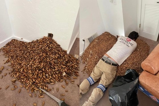 한 가정집 벽 속에서 무려 300㎏이 넘는 도토리가 쏟아져 나와 화제를 모았다.
