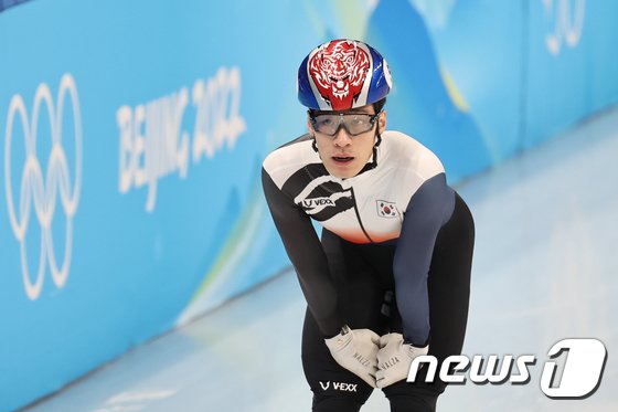 황대헌이 7일 중국 베이징 수도실내체육관에서 열린 2022 베이징 동계올림픽 쇼트트랙 남자 1000m 준결승 경기를 마친 후 숨을 고르고 있다. 황대헌은 레인 변경이 늦었다는 이유로 실격됐다. 2022.2.8/뉴스1 © News1 안은나 기자