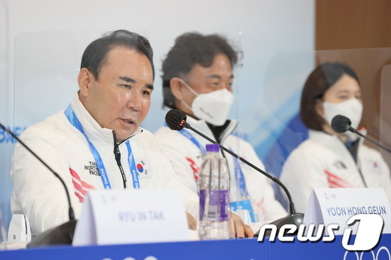 윤홍근 대한민국 선수단장이 8일 중국 베이징 메인미디어센터에서 긴급 기자회견을 열고 2022 베이징 동계올림픽 쇼트트랙 남자 1000m 준결승 편파판정에 대해 국제스포츠중재재판소(CAS)에 제소하겠다는 입장을 밝히고 있다. 2022.2.8/뉴스1 © News1 안은나 기자