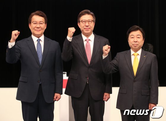 변성완 더불어민주당(왼쪽부터), 박형준 국민의힘, 김영진 정의당 부산시장 후보가 24일 부산시 수영구 부산MBC에서 열린 '부산시선관위주최 부산광역시장 후보자 토론회' 에서 기념촬영을 하고 있다. 2022.5.24/뉴스1 © News1 김영훈 기자