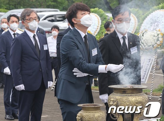 이준석 국민의힘 대표가 29일 오전 경기도 평택시 해군 제2함대 사령부에서 열린 '제2연평해전 승전 20주년 기념식'에서 분향하고 있다. (공동취재) © News1 김영운 기자