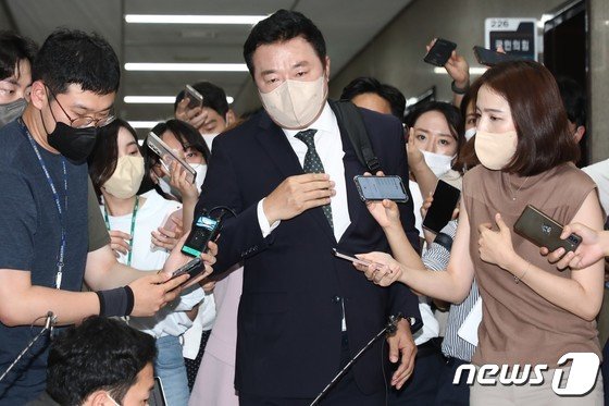 김철근 국민의힘 당 대표 정무실장이 22일 오후 서울 여의도 국회에서 열린 이준석 국민의힘 당대표의 성 상납 증거인멸교사 의혹에 대한 윤리위원회에 출석하며 취재진 질문에 답변하고 있다. 2022.6.22/뉴스1 © News1 이재명 기자