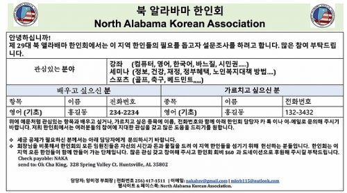한편 북알라바마 한인회는 지역 한인들이 관심이 있는 강좌와 세미나, 스포츠에 대한 수요를 예측하기 위한 설문조사를 하고 있다.