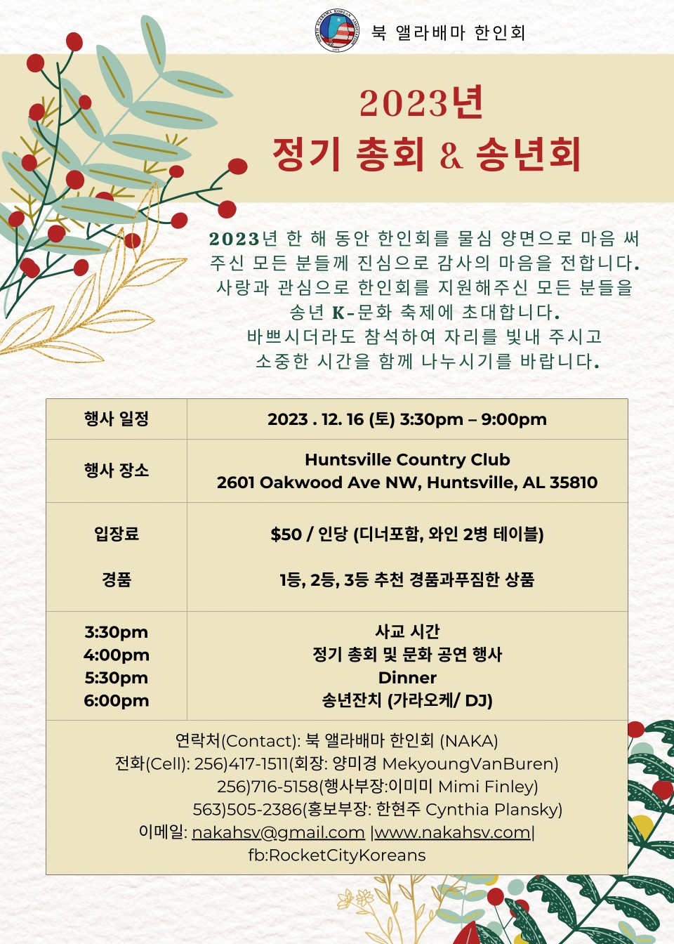북앨라배마한인회(회장 양미경)는 오는 12월 16일 오후 3시30분 헌츠빌 컨츄리 클럽에서 2023년 정기총회 및 송년회를 개최한다.