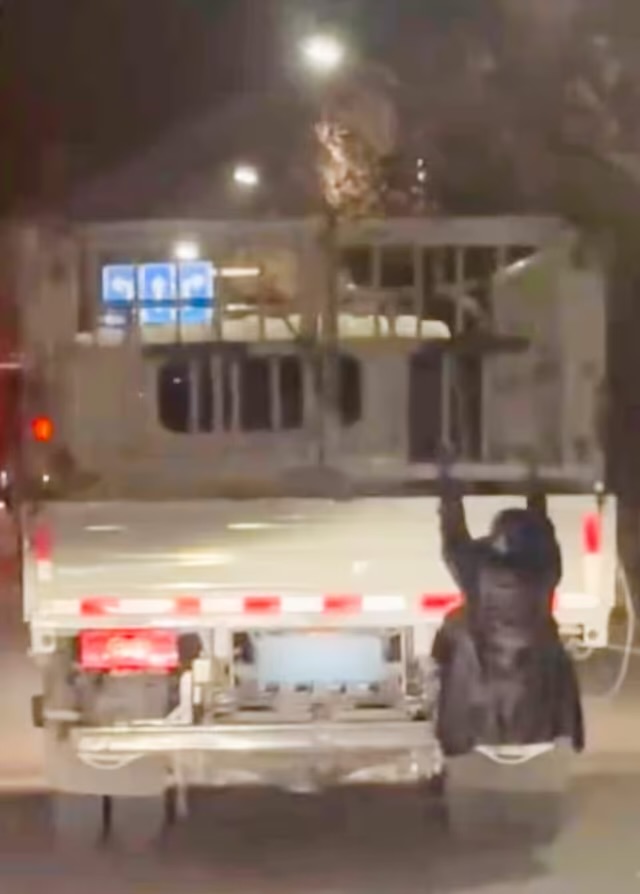 교통경찰은 주행 중인 트럭 뒤편에 아무런 보호 장비 없이 매달려 있는 여성을 발견하고 즉시 차량을 정차시켰다.