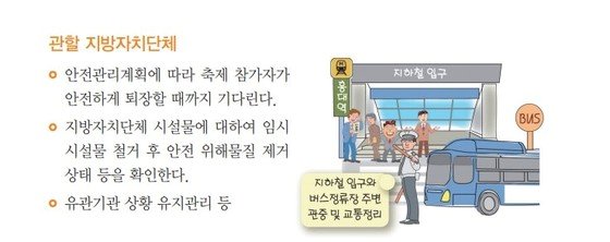 해당 매뉴얼에선 ‘야간축제의 경우 행사가 마무리되면 동시에 많은 인파가 몰려나와 귀가를 서두르다 도로 무단횡단, 교통 혼잡상황이 우려되므로 경찰서, 안전관리 요원은 주변교통 정리와 안전사고 예방대책을 마련한다’고 명시한다.