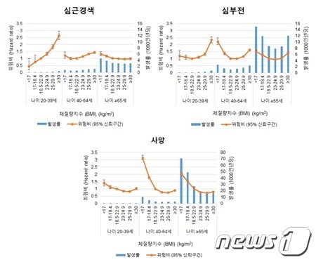 다만, 비만도와 심혈관계 위험의 연관성은 연령대에 따라 확연한 차이를 보였다. 심근경색의 위험은 청년층(20~39세)에서 비만도가 높을수록 비례적으로 증가했다. 반면, 중년층(40~64세)은 U자형, 노년층(나이≥65세)에서는 반비례해 저체중일 때 증가한 것으로 나타났다.
