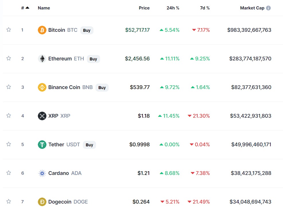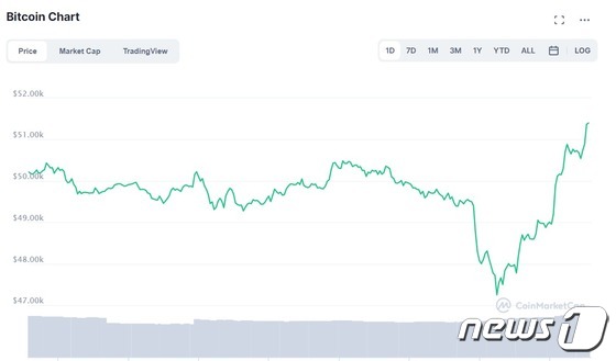 비트코인은 26일 오후 4시 현재(한국시간 기준) 암호화폐 실황 중계사이트인 코인마켓캡에서 24시간 전보다 5.54% 급등한 5만2717달러를 기록하고 있다.