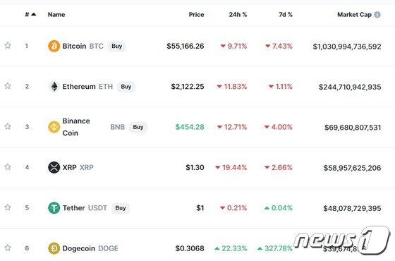 한편 18일 오후 11시 현재(한국시간 기준) 미국의 코인마켓캡에서 비트코인은 9.71% 급락한 5만5166달러, 이더리움은 11.83% 폭락한 2122달러, 바이낸스코인은 12.71% 폭락한 454달러, 리플은 19.44% 폭락한 1.30달러를 각각 기록하고 있다.