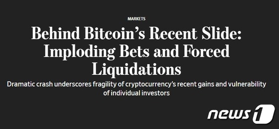 전일 비트코인 등 암호화폐(가상화폐)가 일제히 폭락한 것은 미국의 투자자들이 규제가 덜 한 해외 거래소에 투자해둔 계좌가 비트코인 급락으로 강제 청산됐기 때문이라고 미국의 월스트리트저널(WSJ)이 23일(현지시간) 보도했다.