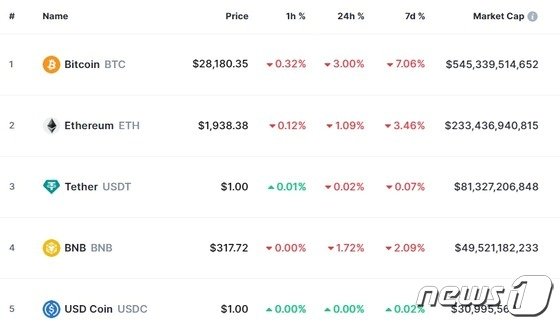 비트코인은 21일 오전 6시 30분 현재 글로벌 코인시황 중계사이트인 코인마켓캡에서 24시간 전보다 3.00% 하락한 2만8180 달러를 기록하고 있다.