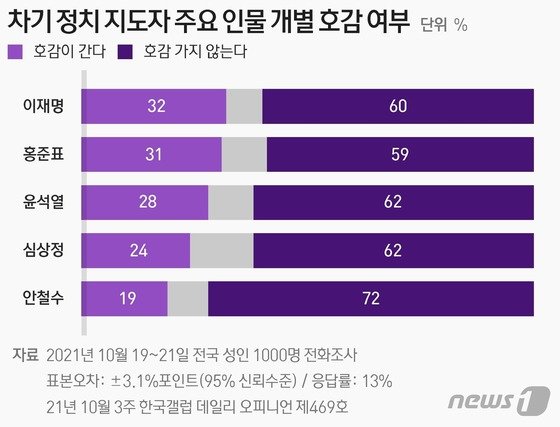 여론조사 전문기업 한국갤럽이 지난 19~21일 전국 만 18세 이상 1000명을 대상으로(표본오차 95% 신뢰수준에 ±3.1%p) 대선 후보 또는 출마 유력 인물 5명 각각에 대한 호감 여부를 질문한 결과다.