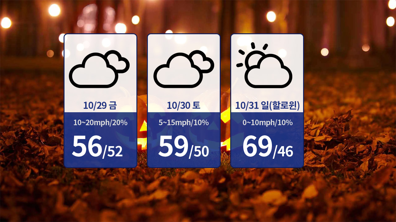 다행히 할로윈은 최소한 약간의 태양과 70도 가까이 되는 높은 기온으로 날씨가 더 좋아질 전망이다. 이 햇살은 11우러로 접어들면서 다음 주까지 계속될 것으로 보인다. 바람도 이 무렵에는 가라앉을 예정이다.