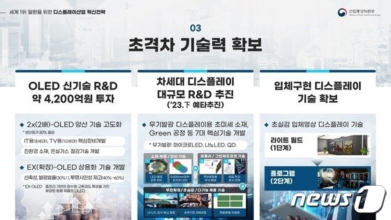 이미 지난 2월부터는 조세특례제한법 상 국가전략기술로 OLED, QD(Quantum Dot), 마이크로LED(Light Emitting Diodes) 등 패널기술 3개 및 관련 소부장 2개 기술 등 총 5개의 디스플레이 핵심기술러 지정해 기업의 투자부담을 낮췄다. 이에 따라 산업은행, 신용보증기금 등 주요 금융기관은 신규 패널시설 투자, 디스플레이 장비 제작자금 등에 약 9000억원의 정책금융을 공급 하고 있다.