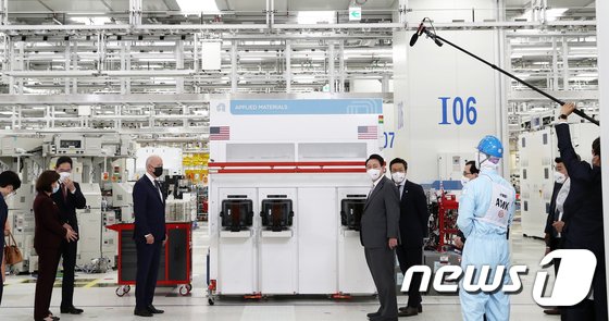 윤석열 대통령과 조 바이든 미국 대통령이 20일 경기 평택 삼성전자 반도체 공장을 방문해 반도체 생산라인을 둘러보며 관계자의 설명을 듣고 있다. 대통령실사진기자단) 2022.5.20/뉴스1 © News1 오대일 기자