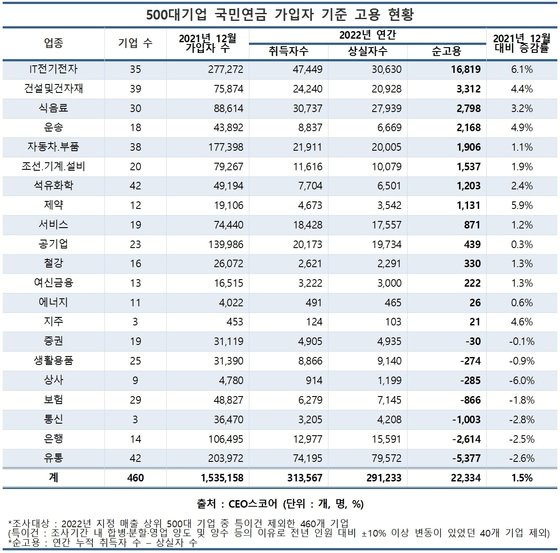 8일 기업데이터연구소 CEO스코어가 국내 매출 상위 500대 기업 중 460개 기업의 국민연금 가입자 기준 고용 현황을 조사한 결과, 지난해 총 순고용 인원은 2만2334명으로 1년 전(153만5158명)보다 1.5% 증가에 그쳤다.