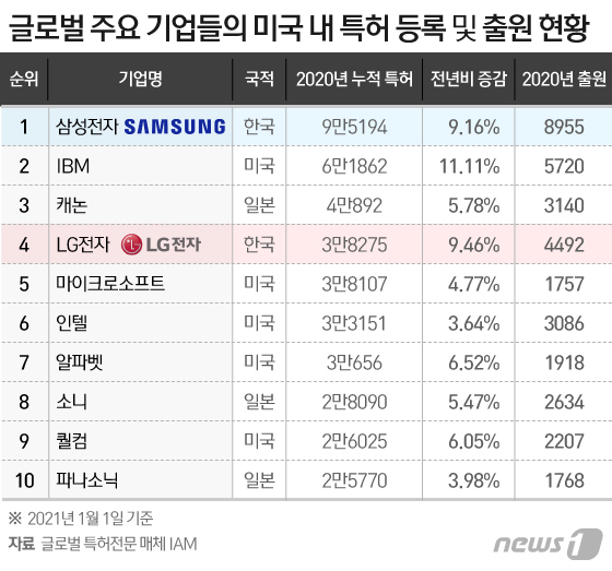 29일 업계에 따르면 영국의 특허전문 저널 ‘IAM’이 최근 발표한 ‘2021 미국 특허 보유 톱 100’ 랭킹에서 삼성전자는 올해 1월 1일 기준으로 9만5194건의 누적 특허를 확보해 1위를 차지했다.