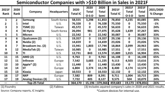 IC인사이츠의 집계에 따르면, 삼성전자는 올 2분기부터 인텔을 앞지르기 시작했다. 삼성전자는 2021년 2분기 203억달러의 매출로, 11분기 만에 글로벌 반도체 매출 1위 자리에 올랐다.