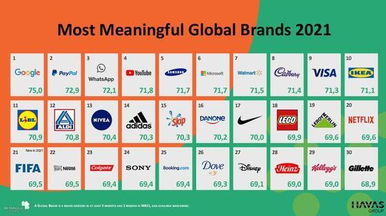 16일 관련업계에 따르면, 삼성은 글로벌 광고 미디어 기업 ‘하바스(Havas) 미디어그룹’이 발표한 ‘2021년 가장 의미있는 브랜드'(Top Global Meaningful Brands Index 2021) 조사에서 평점 71.7점으로 5위를 차지했다.