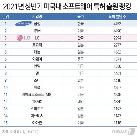 10위권 밖으로는 11위에 마이크로소프트(1345건), 12위에 TSMC(1330건), 13위 스미토모(1197건), 14위 미쓰비스(1147건), 15위 아마존(1118건) 등으로 집계됐다.