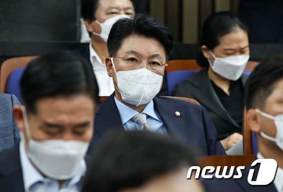 장제원 국민의힘 의원이 20일 서울 여의도 국회에서 열린 의원총회에 참석해 권성동 당대표 직무대행 겸 원내대표의 발언을 듣고 있다. (공동취재) 2022.7.20/뉴스1 © News1 유승관 기자