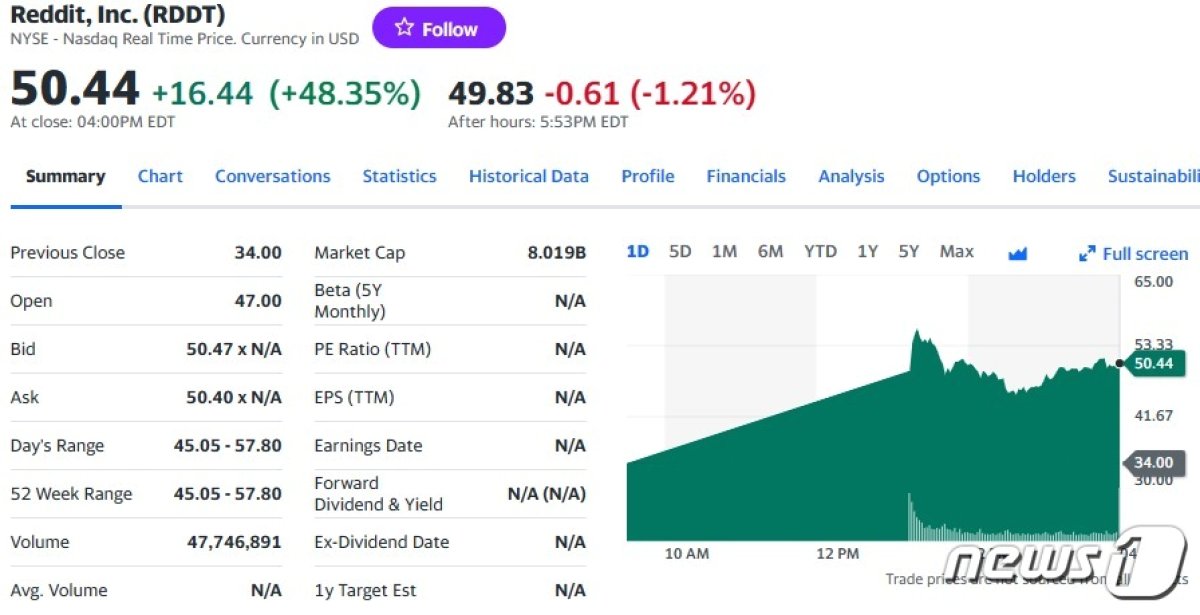 레딧은 21일(현지시간) 뉴욕증시에 데뷔했다. 상장 첫날 레딧은 48.35% 폭등한 50.44달러를 기록했다.