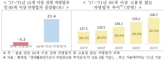 60세 이상 고용원 없는 자영업자는 2017년 137만1000명에서 2021년 168만5000명으로 22.9% 늘었는데, 이는 전체 고용원 없는 자영업자 증가율(2.3%)의 약 10배에 달하는 수준이었다.