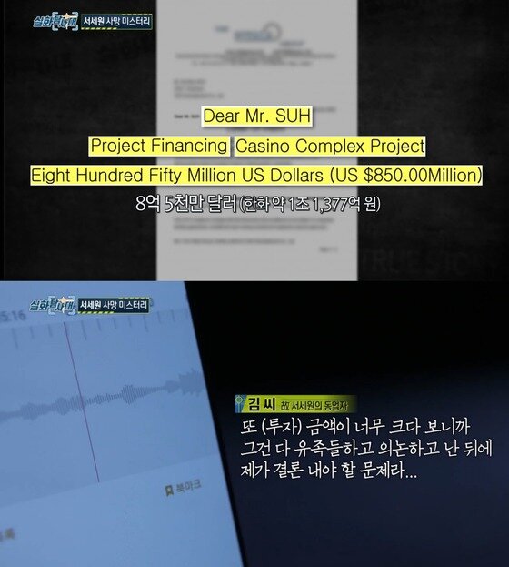 서세원은 재기를 꿈꾸며 사망 두 달 전 투자계약합의서에 서명했다. 8억5000만달러(약 1조1377억원)를 투자하며 높은 수익을 기대하고 있었다. 사망 열흘 전에도 대형 프로젝트 계약을 진행했다. 지인은 “그 프로젝트가 된다, 안 된다는 보장이 없었다. 벌여놓은 사업이 많은데 나는 사기라고 본다”고 안타까워했다.