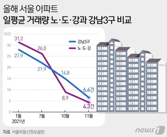 올해 1월 강남3구 일평균 거래량은 27.9건이다. 11월은 이보다 76.9% 줄어든 6.4건을 기록했다. 노·도·강은 같은 기간 31.2건에서 4.3건으로 86.2% 감소했다. 감소폭은 강남3구보다 9.3%p 높았다.