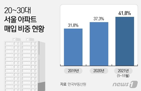 11일 한국부동산원에 따르면 지난해(1~11월) 서울 아파트 거래량은 4만8117건이다. 이 가운데 30대 매입은 1만7609건으로 전체의 36.6%를 차지했다. 전체 연령대 가운데 가장 높은 수준이다.