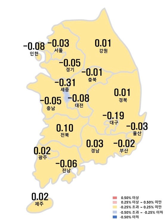 지방은 -0.02%에서 -0.03%로 하락폭이 늘었다. 시도별로는 전북(0.10%), 경남(0.03%), 광주(0.02%), 제주(0.02%), 강원(0.01%) 등은 상승, 세종(-0.31%), 대구(-0.19%), 대전(-0.08%), 전남(-0.06%) 등은 하락했다.