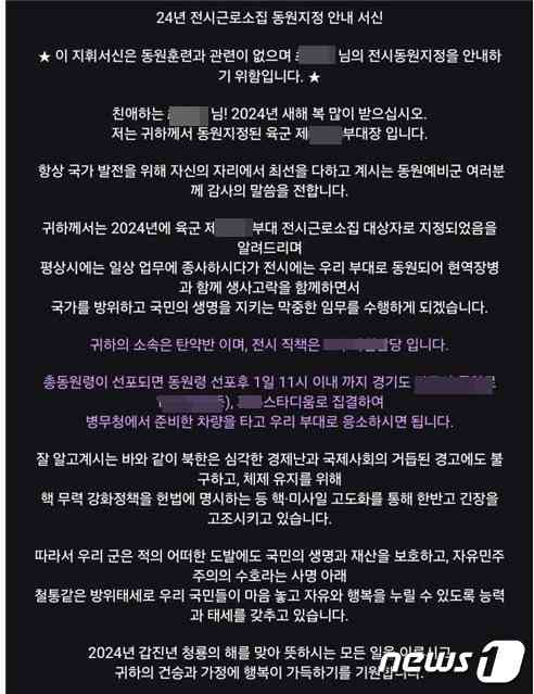 A씨는 14일 오후 자신의 휴대폰으로 ’24년 전시근로소집 동원지정 안내 서신’이라는 문자를 받은 직후 서울에 거주하고 있는 어머니 B씨에게 “아무 일 없느냐” “전쟁난다고 하더라…”라며 불안한 목소리를 전화를 걸었다.