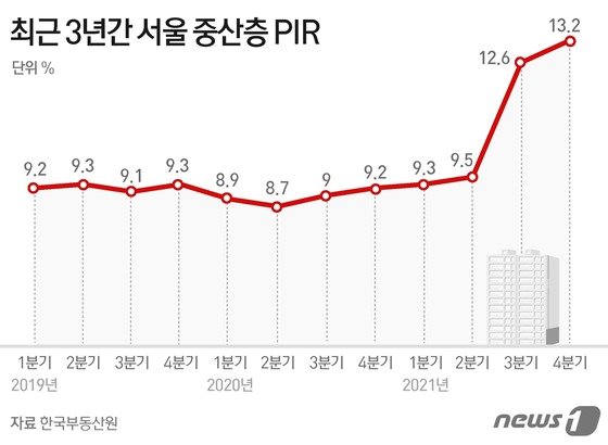 서울 중산층 PIR은 지난해 하반기 급격히 증가했다. 부동산원이 집계 발표한 2012년부터 2021년 상반기까지 서울 중산층 PIR은 적게는 7.5에서 많게는 9.5를 기록했다.