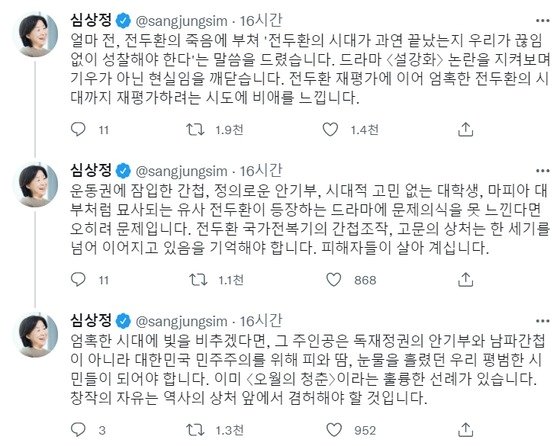 심상정 의원은 “운동권에 잠입한 간첩, 정의로운 안기부, 시대적 고민 없는 대학생, 마피아 대부처럼 묘사되는 유사 전두환이 등장하는 드라마에 문제의식을 못 느낀다면 오히려 문제입니다”라며 “전두환 국가전복기의 간첩조작, 고문의 상처는 한 세기를 넘어 이어지고 있음을 기억해야 합니다. 피해자들이 살아 계십니다”라고 했다.
