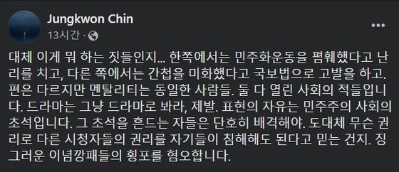 이어 “드라마는 그냥 드라마로 봐라, 제발. 표현의 자유는 민주주의 사회의 초석입니다”라며 “그 초석을 흔드는 자들은 단호히 배격해야, 도대체 무슨 권리로 다른 시청자들의 권리를 자기들이 침해해도 된다고 믿는 건지. 징그러운 이념깡패들의 횡포를 혐오합니다”라고 덧붙였다.