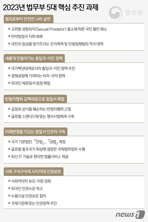 법무부는 “기본을 지키면서 국민만 바라보며 오늘 발표한 업무계획을 신속히 추진해 나가겠다”고 밝혔다.