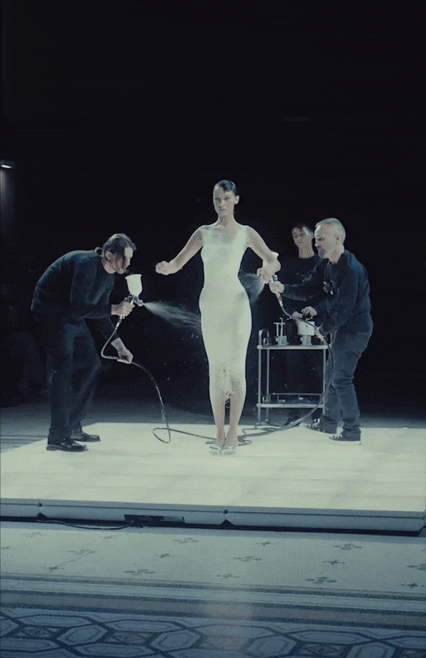 하디드가 무대 가운데 서자 스프레이 총을 든 두 명의 남성이 등장했다. 이들은 하디드를 향해 하얀 액체를 분사했고, 이 액체는 흡사 거미줄처럼 보였다.