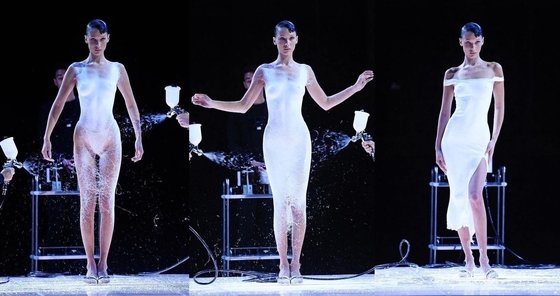알몸에 스프레이를 뿌리자 순식간에 근사한 드레스 한 벌이 완성됐다. 파리 패션위크에서 선보인 ‘스프레이 옷’에 대한 이목이 쏠리고 있다.