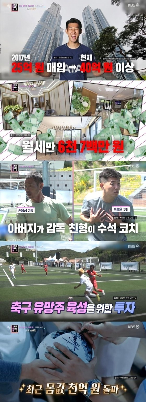 손흥민이 현재 거주 중인 영국 런던의 고급 빌라는 런던의 대표적인 부촌에 자리하며 월세만 6700만 원이 넘는 것으로 알려졌다. 이어 손흥민은 고향인 강원도 춘천에 170억 원을 들여 ‘손흥민체육공원’을 조성, 축구 유망주 육성을 위한 투자도 함께하고 있다. 최근 손흥민은 몸값 1000억원을 돌파하며 뜨거운 관심을 받고 있다.