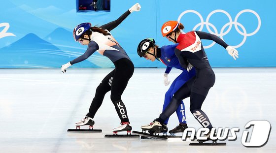 최민정이 16일 오후 중국 베이징 캐피털 실내경기장에서 열린 2022 베이징 동계올림픽 쇼트트랙 여자 1500m 결승에서 1위로 결승선을 통과하고 있다. 최민정은 이날 금메달을 따내며 올림픽 2연패를 달성했다. 2022.2.16/뉴스1 © News1 박지혜 기자