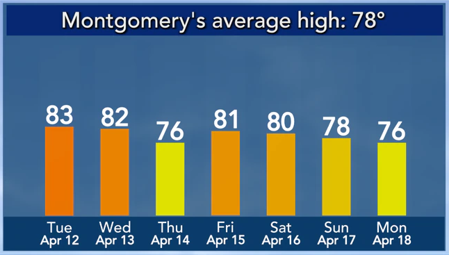 이 한랭전선은 목요일 오후 앨라배마주 중부를 출발할 것이며, 이로 인해 비와 폭풍은 오후 늦게 잦아들겠다. 한랭전선이 지나가고 있음에도 불구하고 최고기온은 여전히 70도 대로 올라가겠다.