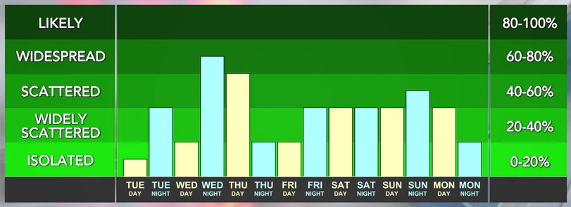 한랭전선이 북서쪽에서 밀려오면서 수요일 밤부터 목요일 아침까지 비와 폭풍의 범위가 확대된다. 이때가 이번 주에 비올 가능성이 최고조에 달할 때이다. 악천후 위험은 그다지 높지 않지만, 특히 I-65 고속도로 서쪽을 따라 악천후 위험이 있다.