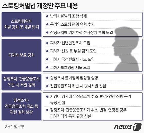 법무부는 개정안을 통해 스토킹범죄 피해자에 대한 보호조치는 아동학대·가정폭력 피해자에 준하는 수준으로 끌어올리겠다고 밝혔다.