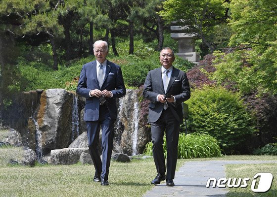 조 바이든 미국 대통령과 정의선 현대차그룹 회장이 바이든 대통령의 방한 숙소인 서울 용산구 그랜드 하얏트 호텔에서 면담 관련 연설을 위해 함께 이동하고 있다. (현대자동차그룹 제공)2022.5.22/뉴스1