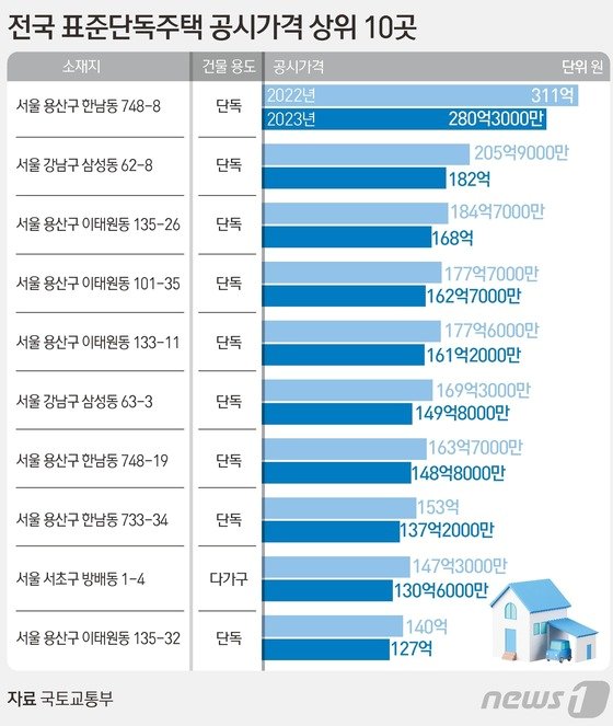 국토교통부가 14일 공개한 2023년 표준주택 25만가구의 공시가격(안)에 따르면 서울 용산구 이태원로55라길에 위치한 단독주택의 공시가 예정액은 280억3000만원이다.